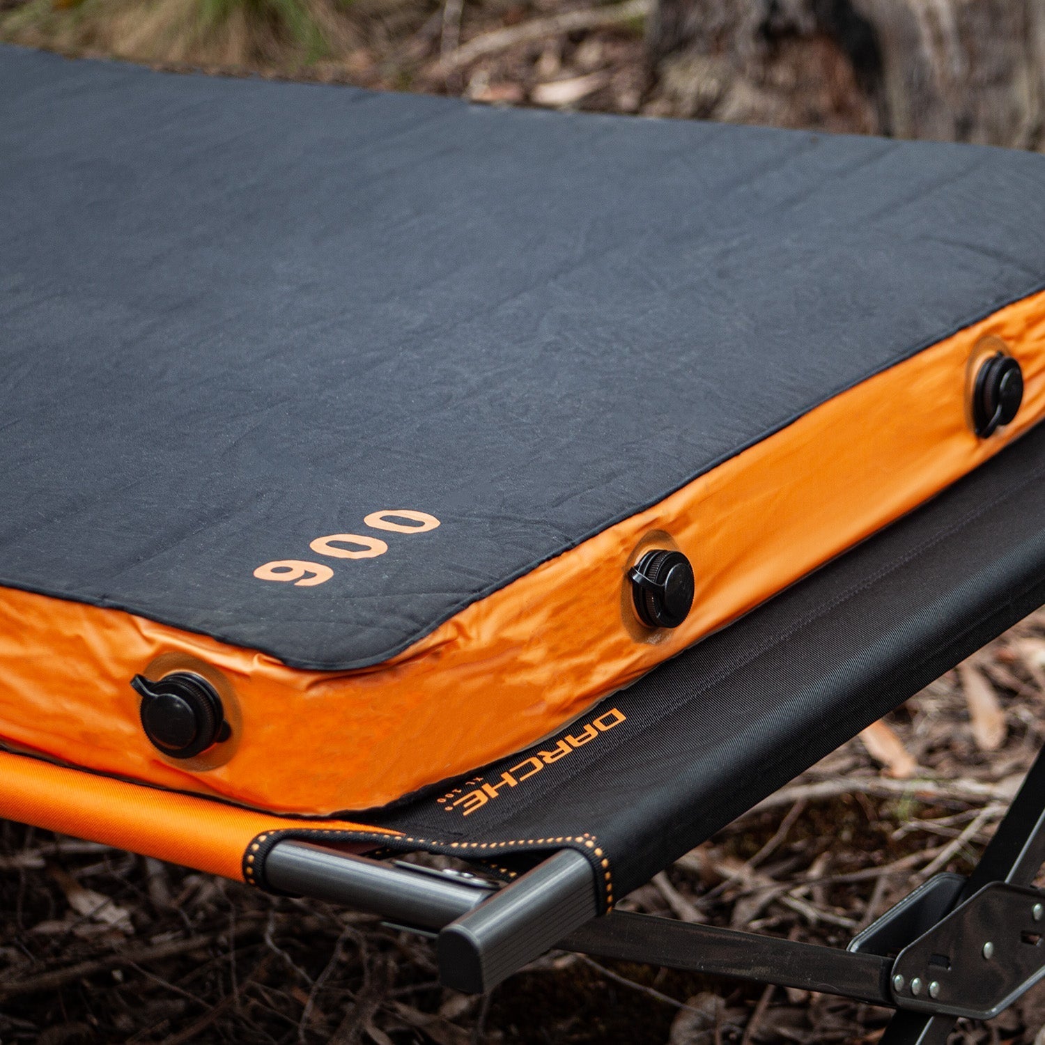 The top is constructed from a rugged 75D peach finished polyester with a luxurious finish, and the underside is a waterproof 300D oxford with PVC coating so it’s easy to wipe down. This fully bonded mat has curved edges to make it easy to fit into your swag – this mat is also designed to fit on top of most camping stretchers. Once inflated, this mat provides 100mm of cushioned comfort and is also created to withstand the punishing Australian conditions.