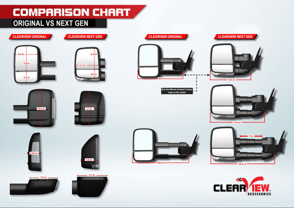 Like all our towing mirrors, our Clearview® Next Gens are true replacement mirrors, designed to use the same holes, fittings, and wiring (when applicable) as your original mirrors for plug & play installation. All Clearview Towing Mirrors® are engineered specifically for each vehicle and feature most of the same functionality as the vehicle’s factory mirrors.