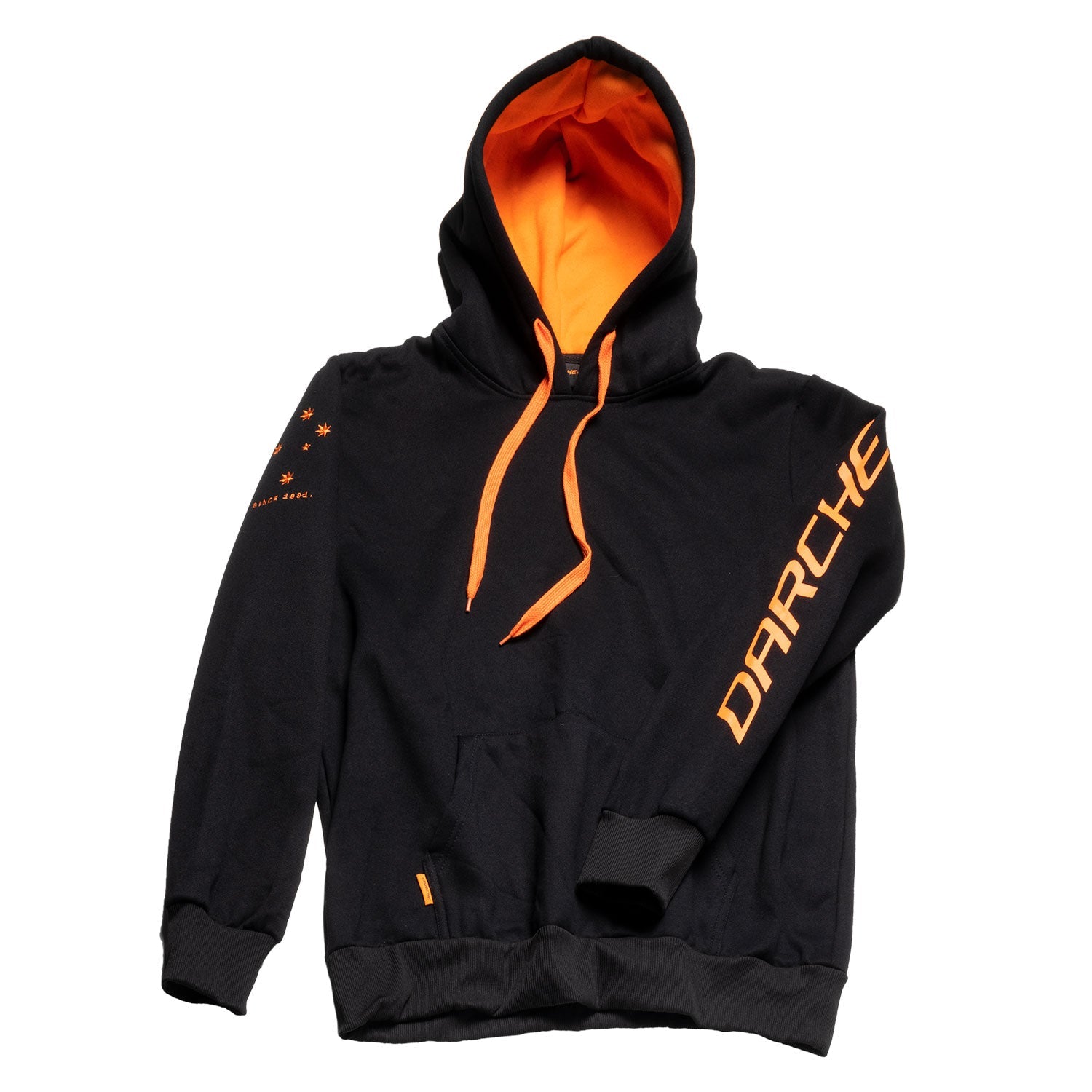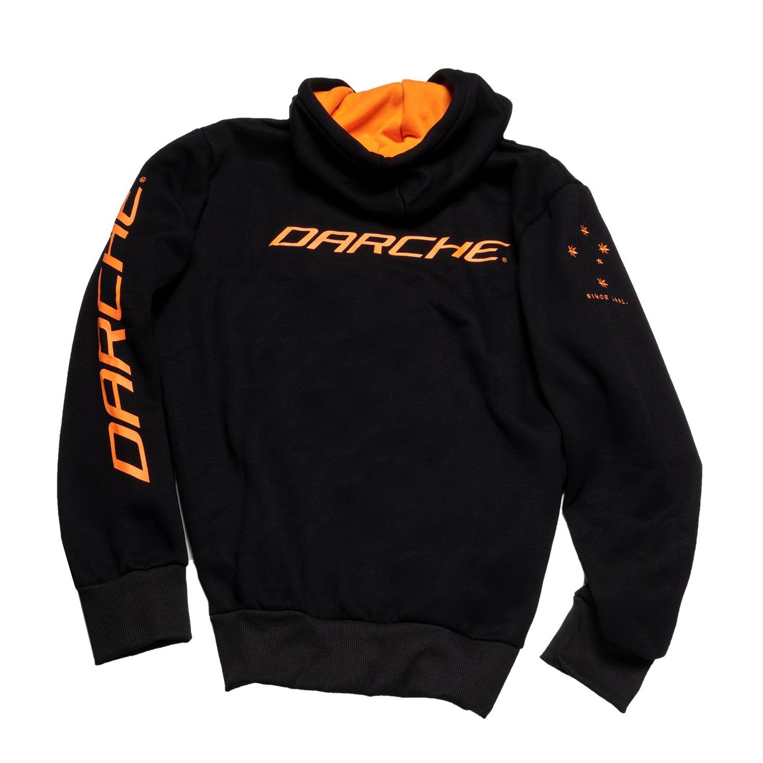 Be seen in the classic DARCHE Original Hoodie. The bold design will get you noticed anywhere, whether you’re out on the open road or just sporting a casual urban look, keep warm and cosy in your rich black hoodie with its contrasting, orange-lined hood.