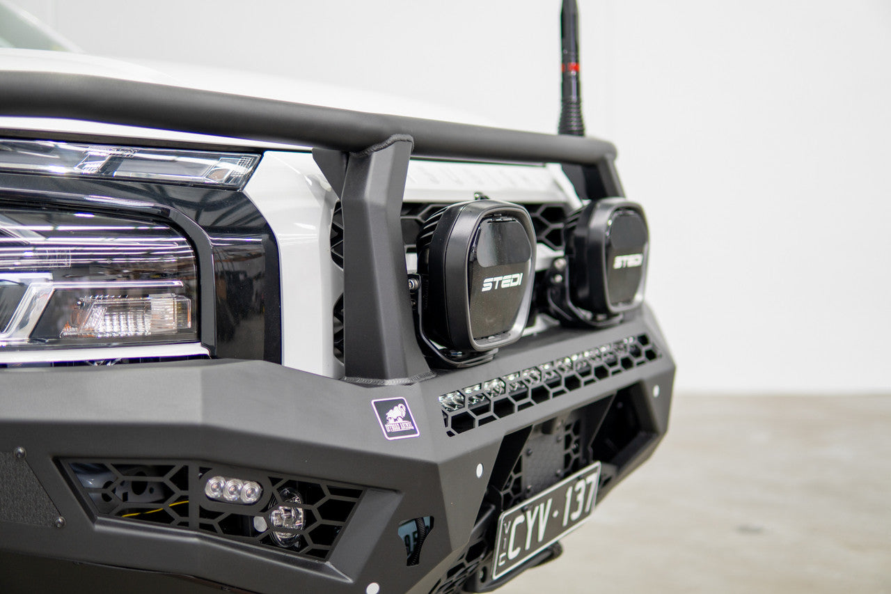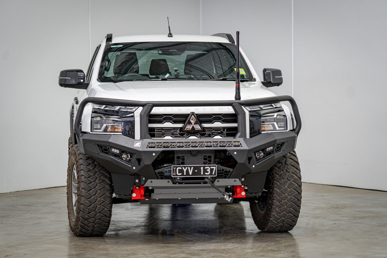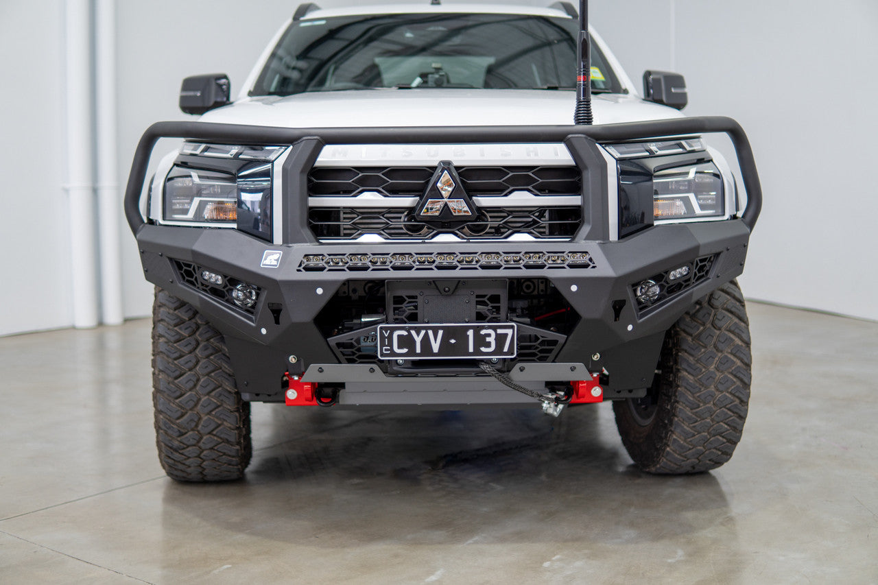 Meet the Toro bull bar, the ultimate Mitsubishi Triton upgrade. Crafted from reinforced steel, zinc plated and powder coated in matte black powder coat. It's built to tackle tough terrain and protect your vehicle from Animals while adding a sleek aggressive look to your ride. Designed for easy installation, it fits your Triton perfectly, enhancing protection and style wihtout compromising functionality. With integrated LED mounts for improved visibility, the Toro bar turns your Triton into and Off-road or On-road conqueror. Ready for adventure? Equip your Triton with the Toro bull bar.
