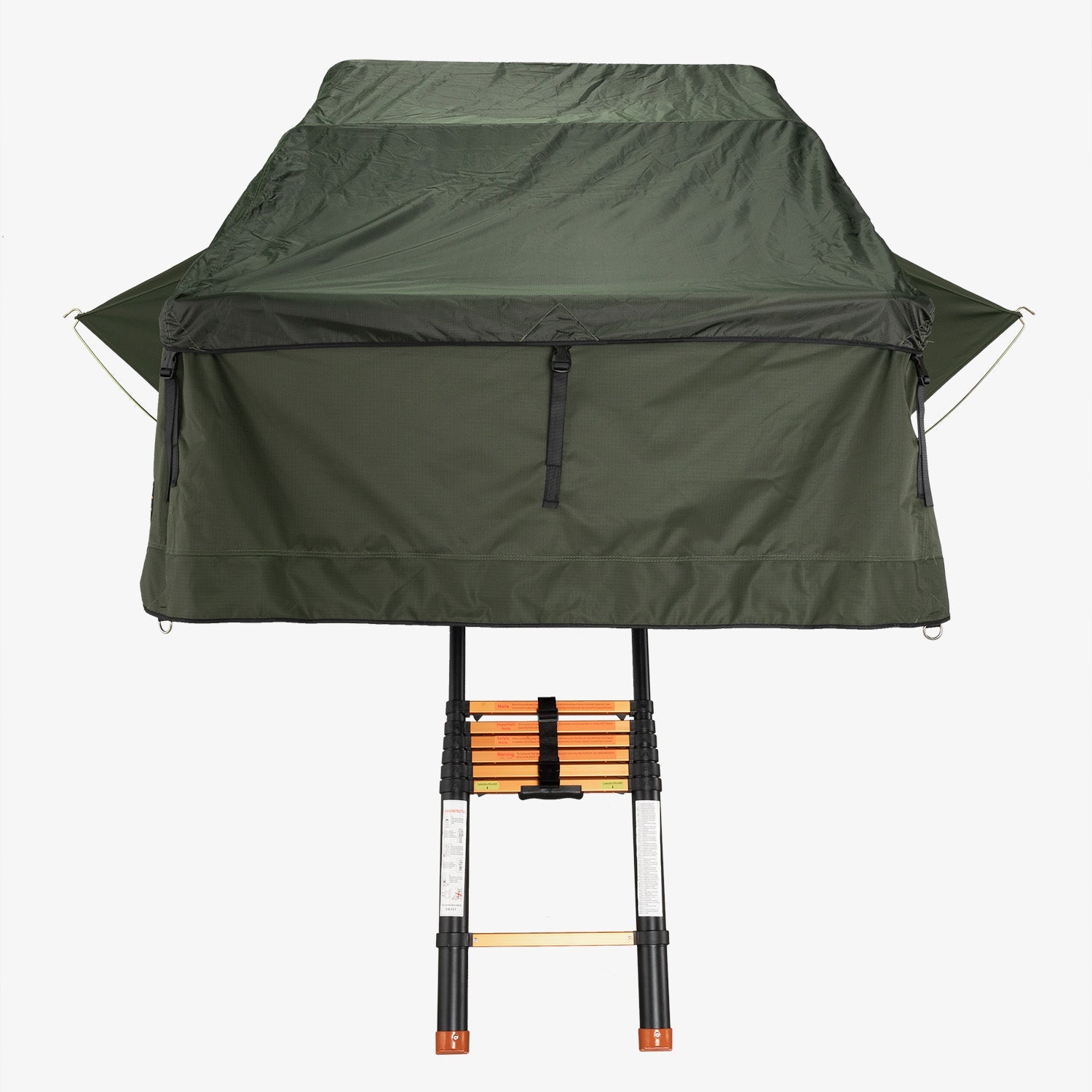 The Panorama series is made Body Material: ecoWGAFTM fabric (280gsm polyester oxford ripstop/100% recycled polyester). This tent has an impressive PU 5000mm water rating, seam sealing and a removable polyester fly that will keep you dry in extended rainy conditions, giving you great protection from the elements all year round. The tent includes a premium quality, high-density 50mm mattress with a removable cover and water-resistant base. This high spec RTT is made with an insulated baseboard, constructed from heavy-duty compressed checker-plate aluminium. The kit also includes a fully removable, durable PVC cover for protection when you're in transit.