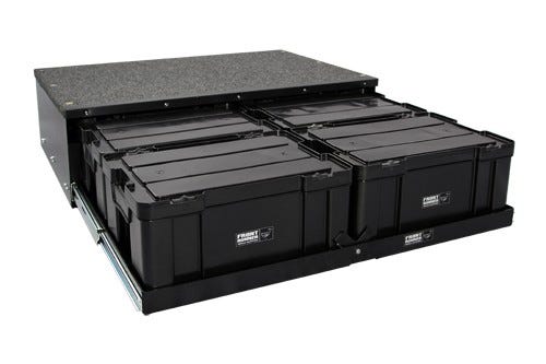 If Front Runner doesn’t offer a vehicle-specific drawer kit for your make and model vehicle, consider this “universal” drawer kit. Since these drawers will only fit into appropriately sized vehicles, please see SPECS for exact product measurements. This specific drawer kit was designed to fit into vehicles with a smaller than usual cargo area. This 4 Cub Box Drawer / Wide kit includes a sliding drawer system, latch mechanism and detailed fitment instructions. SBOX001, the heart of this modular storage system, are perfectly sized for kitchen support, dried goods, tools, camera gear, toiletries, even cloths. These latch-to-close, stackable and durable Cub Pack storage containers are made from black, high strength plastic and have integrated grips for easy carrying. High-strength bearing slides allows the drawer to extend nearly 100% from the anchored base. Fitted with a latching mechanism, the drawer is kept in place when in the closed position. 113kg/ 250 lb per drawer load carrying capacity. The flat deck allows you stack 150kg / 331 lb of gear across the surface. Customize your own storage configurations. Stack and secure luggage, SBOX031, SBOX001, aluminum boxes and other storage containers to the upper deck using STRA034 or other straps as well as RAIL007 and RRAC012. Finished with the same durable black powder coating as the Front Runner Slimline II Rack. The 4 Cub Box Drawer / Wide can be easily installed. Depending on your vehicle’s make and model, drilling may be required. All Front Runner Storage Systems are backed by a 2-year warranty. Note: These “universal” drawers do not come with a vehicle specific deck completion set or faceplates.If this Drawer system is not mounted onto a rigid surface, we recommend adding SSCA021 or SSCA020.If you have any questions about whether or not this product will fit your vehicle, please contact Front Runner before purchase.*Please Note: Cub Packs are not included when purchasing this Drawer System and are sold separately.Please Note: Installation of this product requires a Rivnut tool. We suggest using the VACC016.