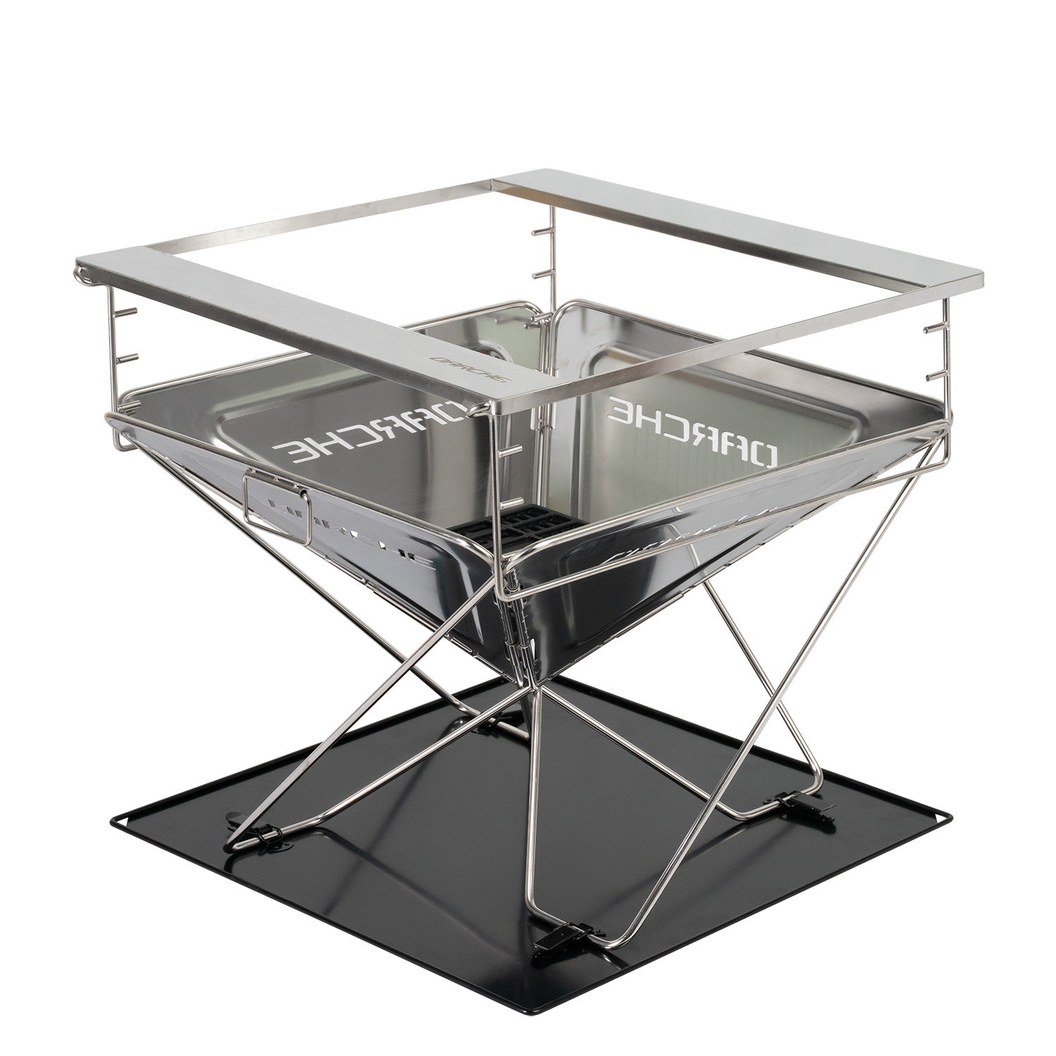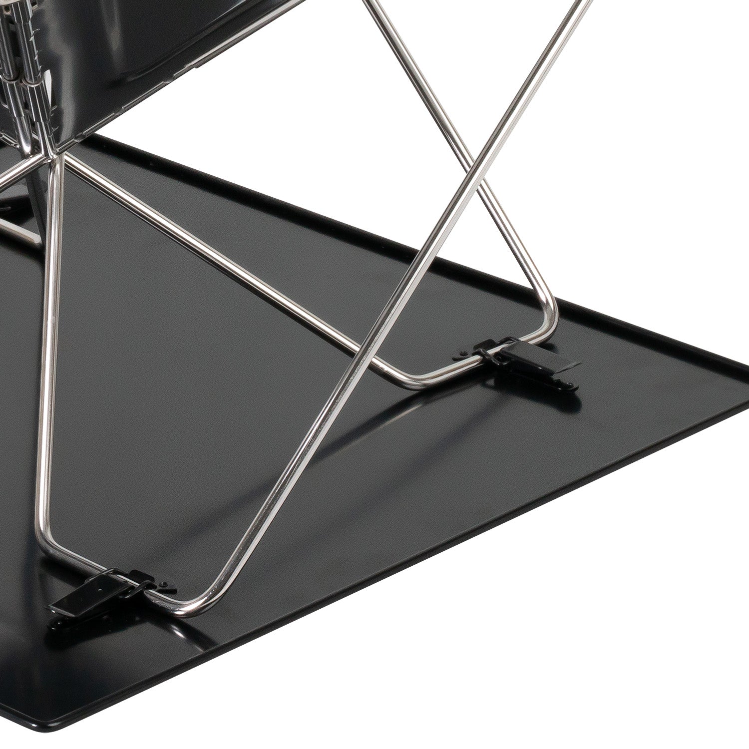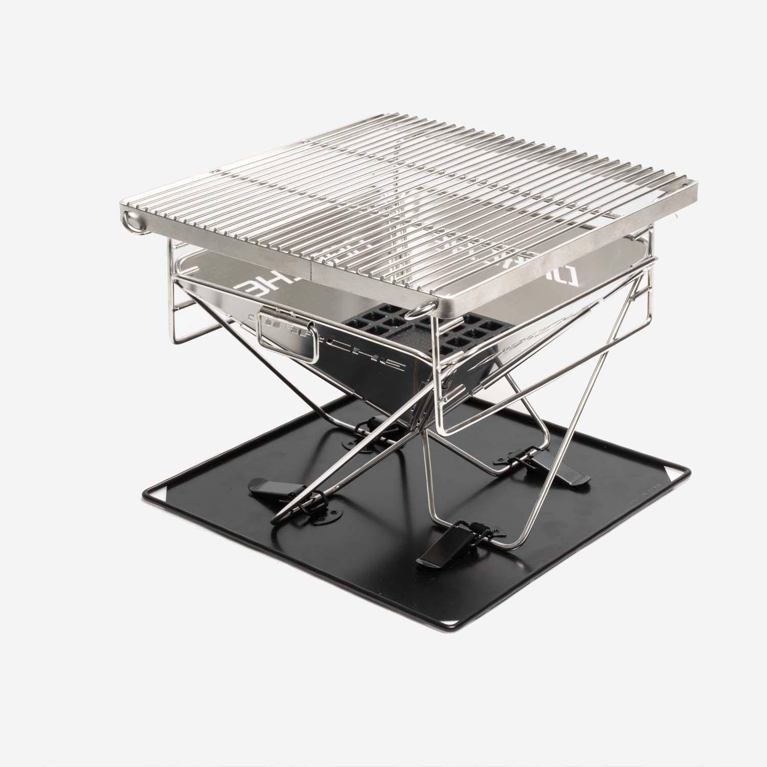The cast iron trivet provides a flat base for the coals to sit as well as increasing airflow for your heat source while the steel base plate acts as a heat shield and will catch any falling embers and makes for an easy clean up.