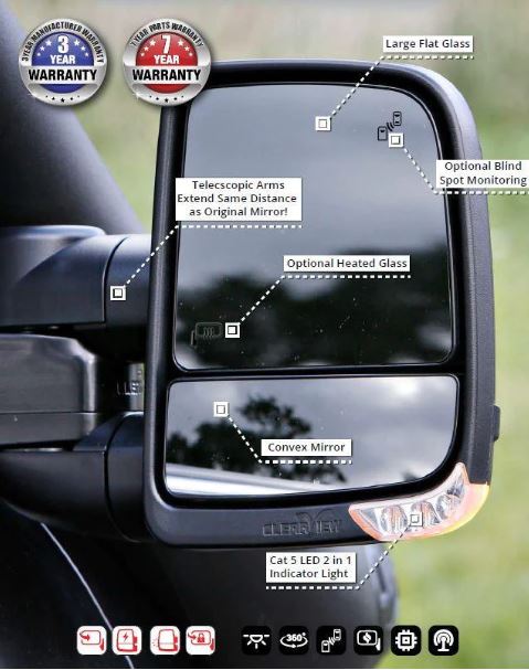 All Clearview Towing Mirrors® are engineered specifically for each vehicle and feature most of the same functionality as the vehicle’s factory mirrors.