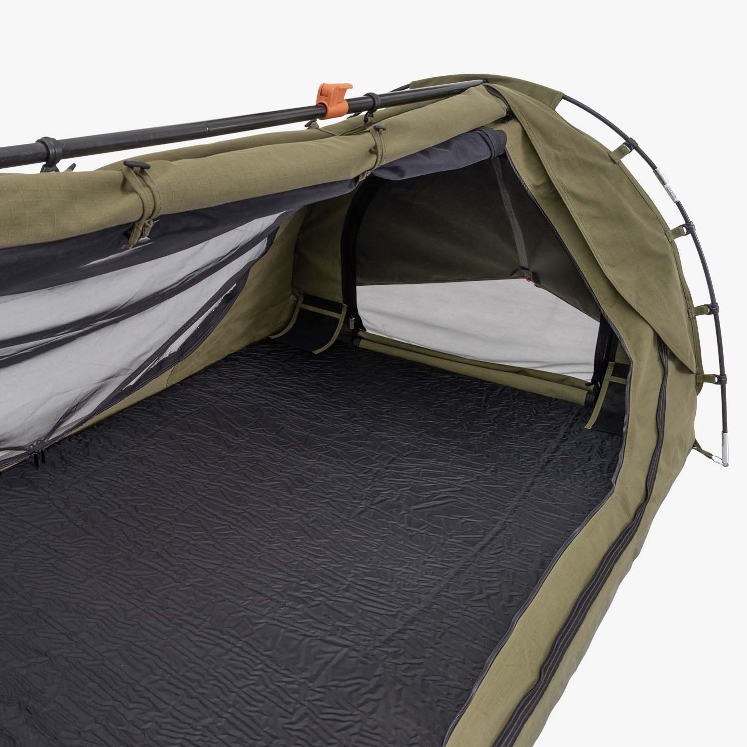With full length canvas storm flaps on both sides, you get uninterrupted views from sunrise to sunset, perfect for those campers that want to drift off under the starry night sky. Setup takes a couple of minutes with two composite poles, plus the unique trigger lock ridge pole. Inside is spacious with plenty of head room to move around. With two massive super-fine mesh doors and two zip down ventilation windows with storm flaps, this swag has unparalleled ventilation, keeping you cool while ensuring you’re well protected from the elements all year round. The canvas storm covers can either be rolled up or converted to awnings, giving you extra shade and protection in all weather conditions. The Dusk To Dawn is made from premium 420gsm ripstop polycotton canvas with an impressive PU 800mm waterhead rating. There’s also internal seam sealing and a reinforced, heavy-duty 600gsm PVC bucket floor to keep you dry in rainy conditions. This swag includes a premium quality, high-density 70mm foam mattress with a removable cover. The canvas swag bag is made from the same quality canvas as the swag and is great for storage and protects the swag when you’re on the road.